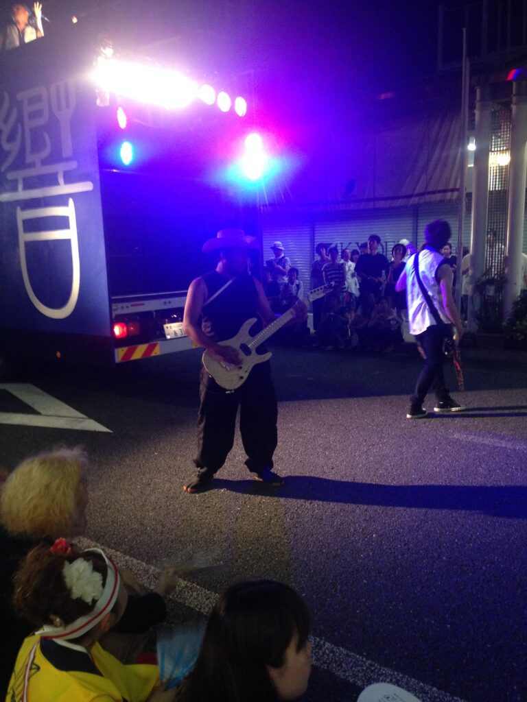 チームの先頭に登場し、装飾や照明、仕掛けが施されたトラックが踊り子を率います。地方車には音響設備やスピーカーが搭載されており、音楽を鳴らします。地方車上に設けられたステージにはマイクを持ったパフォーマーや演奏者などが乗り込み、踊り子を鼓舞しており、まさにチームの象徴とも言えるでしょう。